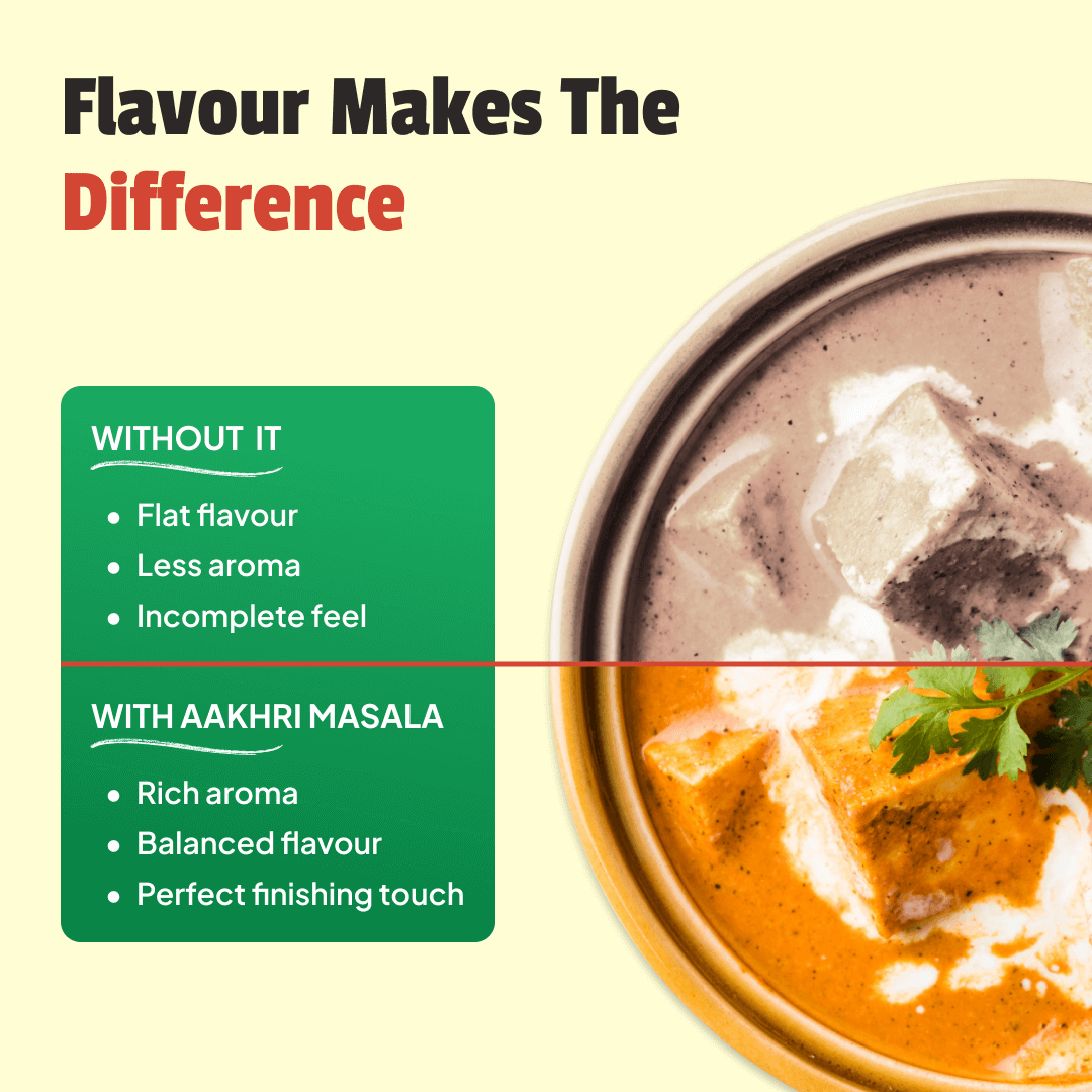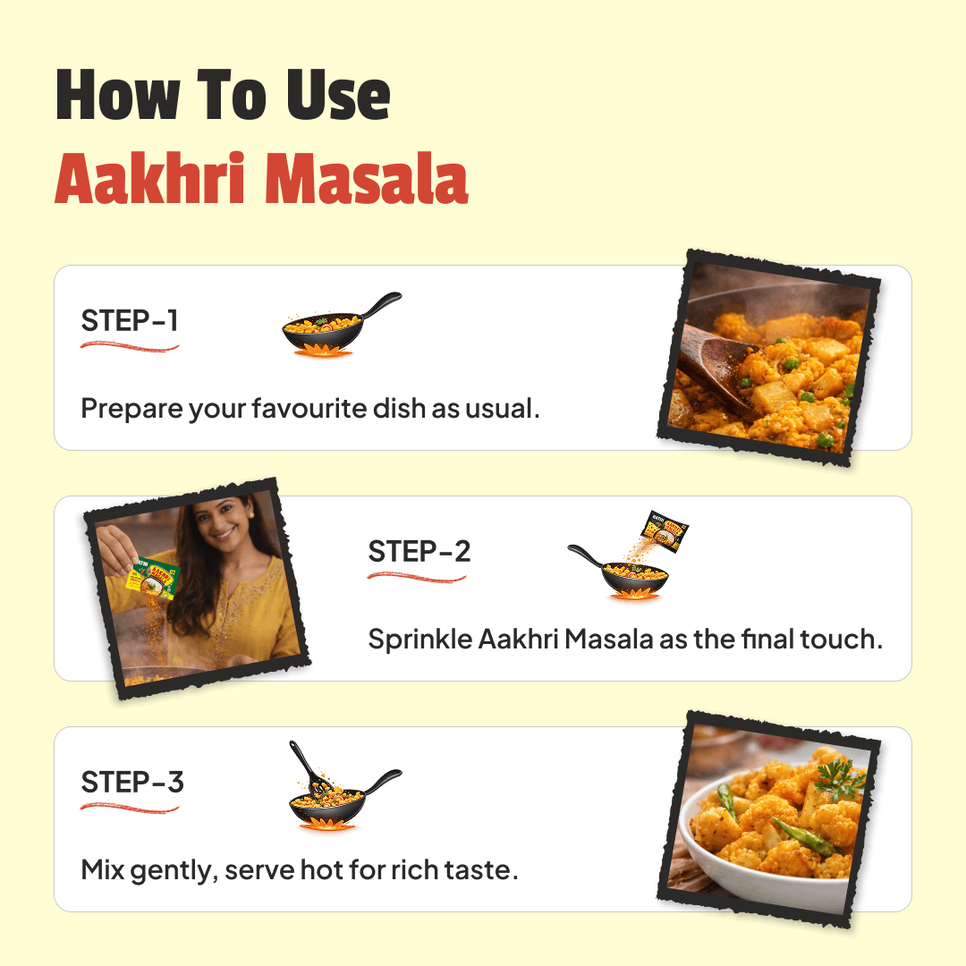 Sprinkle Aakhri Masala on daily food recipes like sabji, biryani, and other dishes for instant taste.