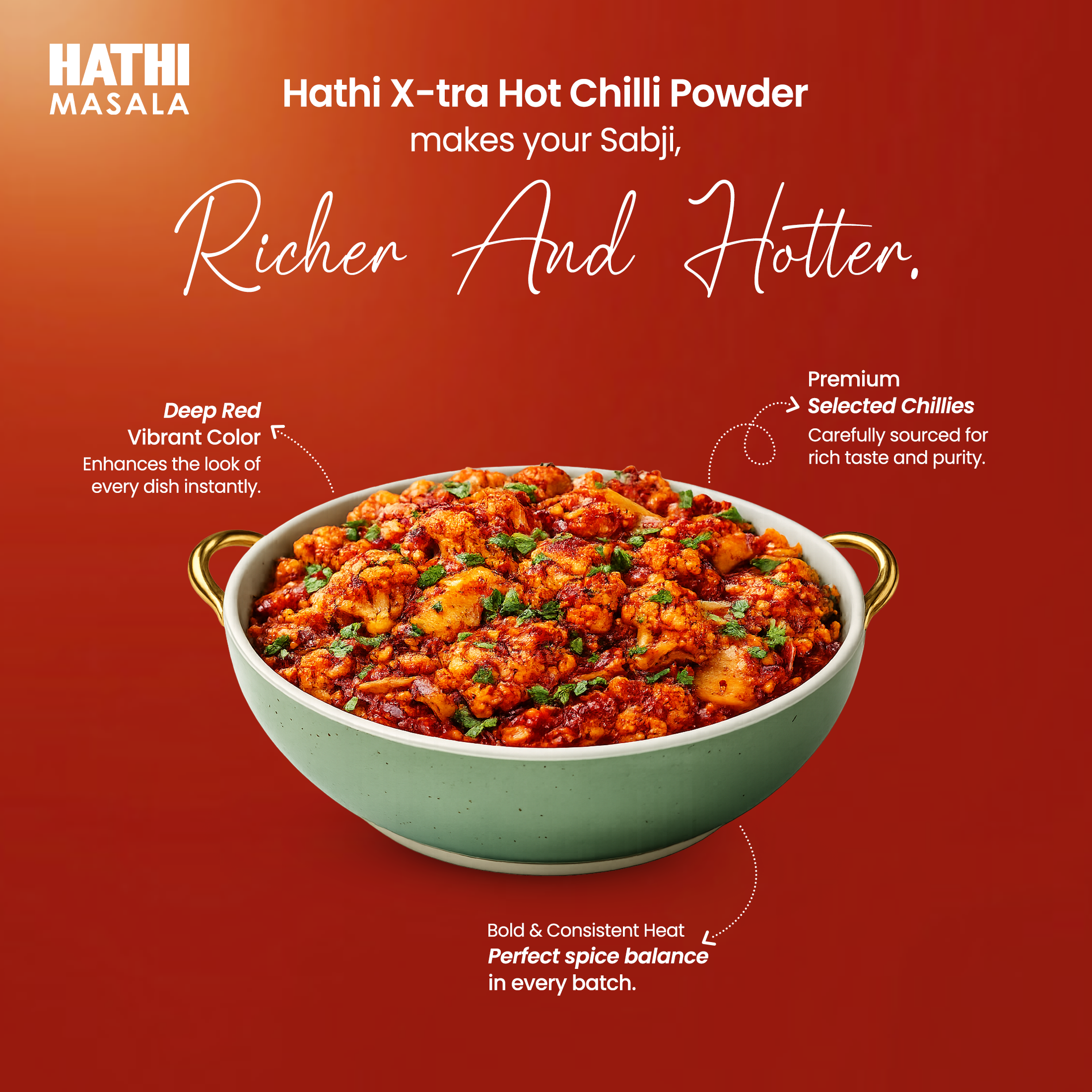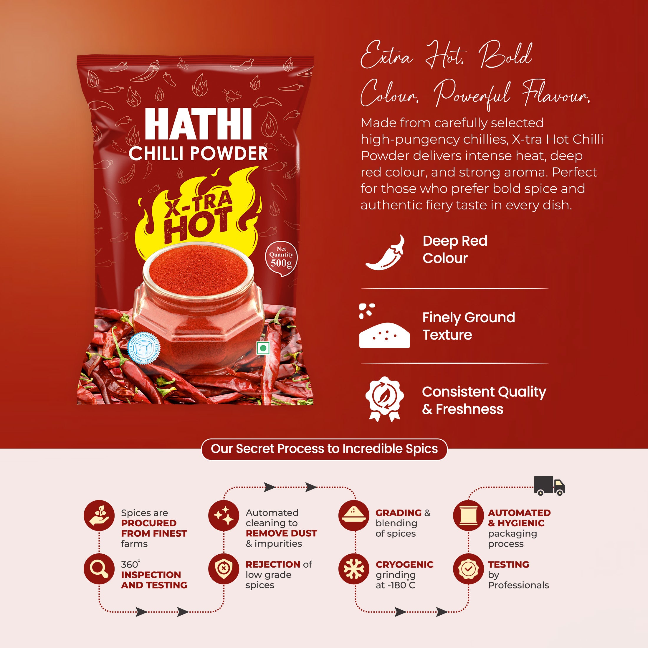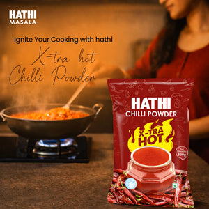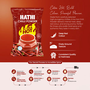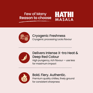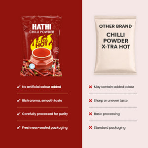 Hathi Masala's X-tra Hot Chilli Powder is made for spice lovers. We pick the hottest chillies and grind them cold to keep everything locked in: the oils, the smell, and the heat and automated cleaning to remove dust and impurities. You get strong spice, true flavour, and rich red colour. Use it in curries, snacks, marinades, and more. If you love heat in your food, this one's for you.
