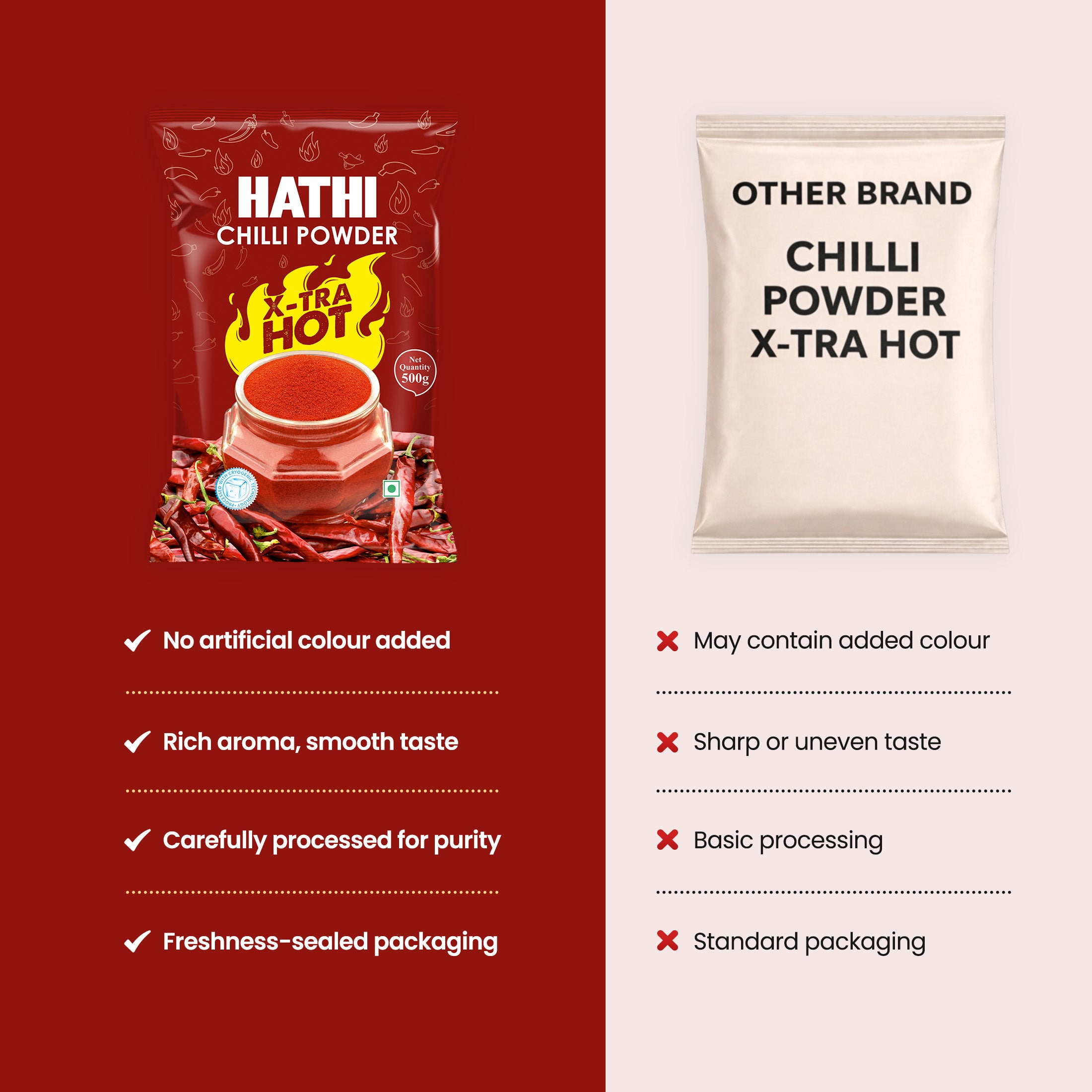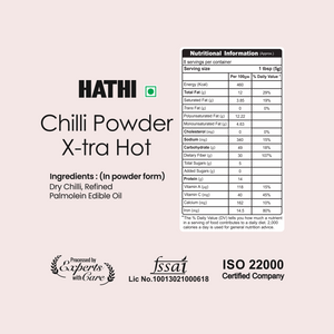 Hathi Masala has been making spices for over 65 years. We only choose the hottest, best chillies around. We grind them cold, not hot like cheap brands do. Everything stays clean during processing with good machines. They are packed in fully automatic systems without human hand touch. We never add artificial colours or chemicals. We have ISO certification for safety standards. Every batch gets tested in our lab to check for quality. Our X-tra Hot Chilli Powder brings real heat with quality you can count on every time.
